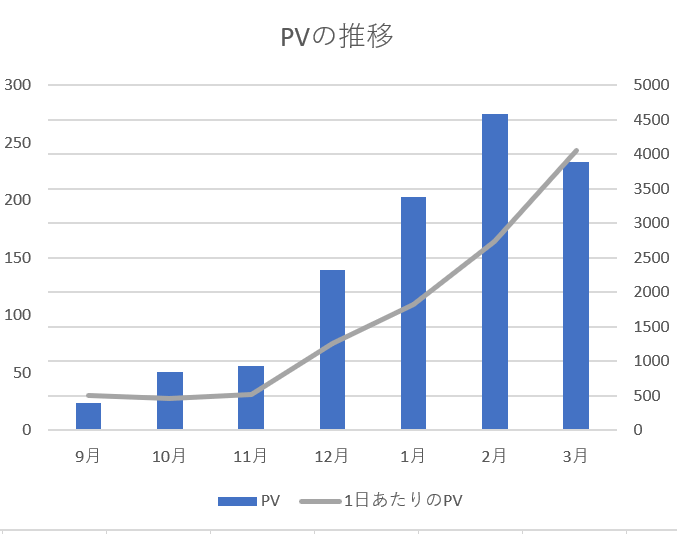 もう一度見てみると、ほとんど投稿していない1月2月も、PVが上昇していることが分かります。(まあ記事書かなくてもPVが上昇したからさぼった感はある笑)