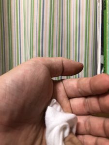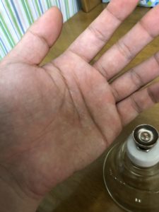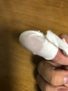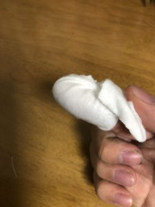 その左手に右手のネル布をつけます。ネル布が全体的に湿るようにします。