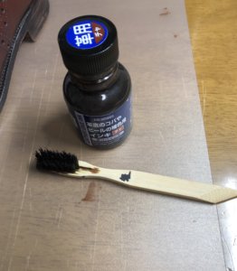 今回もコバを紙やすりで削り、その後コバインキを3回ほど重ね塗りしていきます。一度に大量に塗るのではなく、1回塗って乾いたらまた塗るという形で3回塗りました。