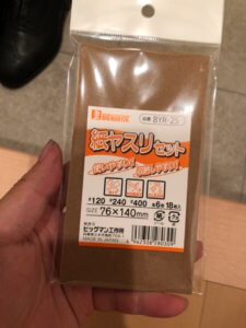 紙やすりは、先日東急ハンズで購入した紙やすりを使います。240番手の紙やすりで毛羽立ち等を削り、400番手て仕上げをします。