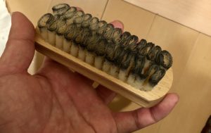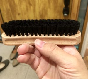 柔らかい馬毛ブラシで靴に溜まった砂や埃や汚れなどを落としていきます。