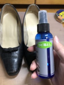 靴に中もしっかりケアします。アルコールシートで汚れを拭き取ったらカビ落としスプレーを吹いていきます。