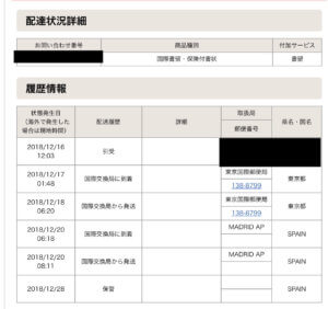 2018年12月16日に発送しまし、スペインには12/20に届きましたがそこからまさかの保留になってしまいました。彼女に聞いたらスペインの郵便局は休みが長いらしく、ちょうど冬休み中にスペインに届いてしまい、クリスマスプレゼントのつもりが2018年以内に届かなく結局2019年1月3日に届きました。