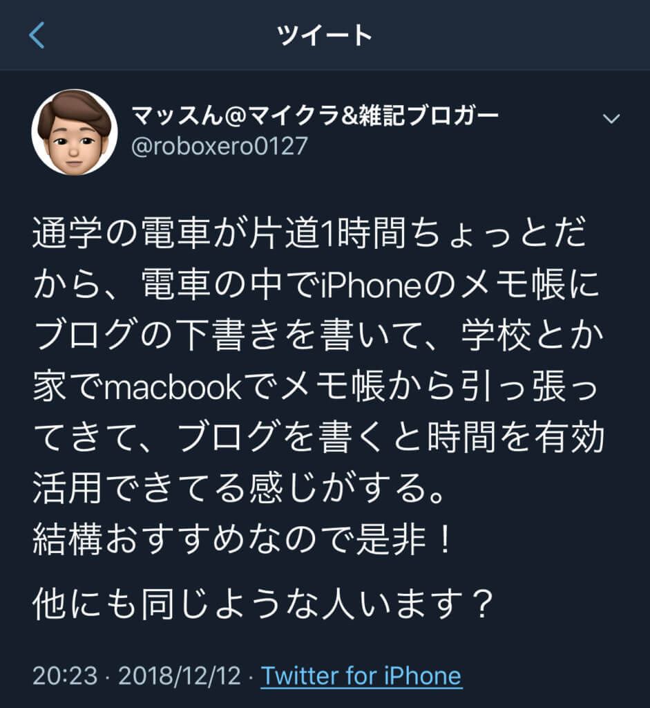 具体的には電車内でiPhoneの純正メモで記事の下書きを書き、学校や家でmacbookから純正メモの下書きをコピーして、デザインの修正等を行なっています。(流石にスマホだけで、デザインの修正までは大変です僕的には)