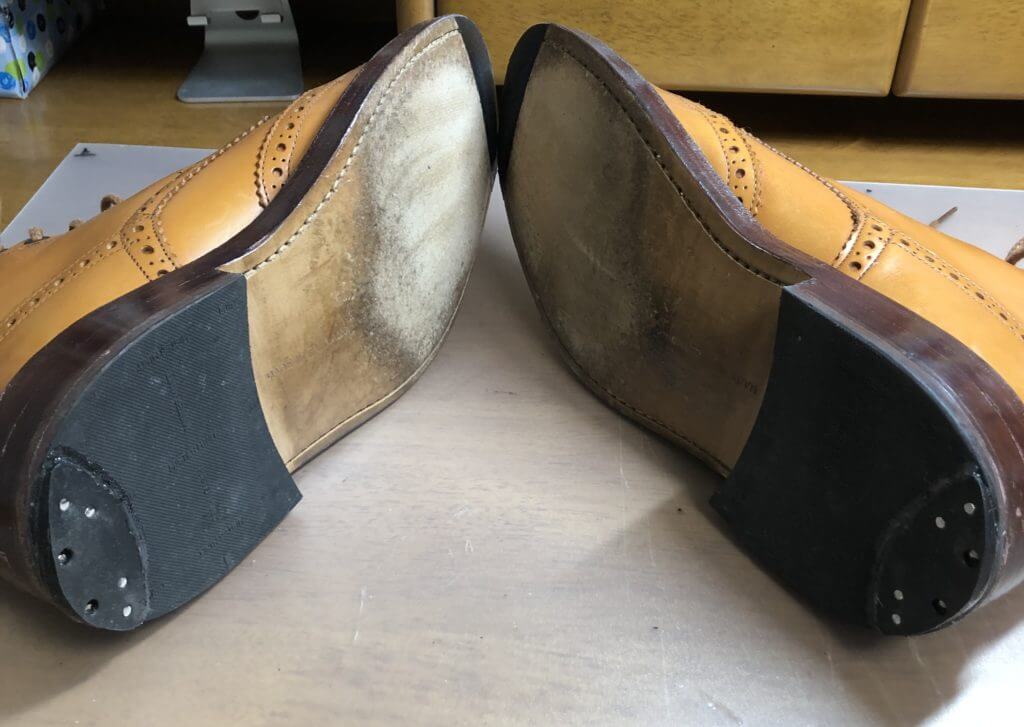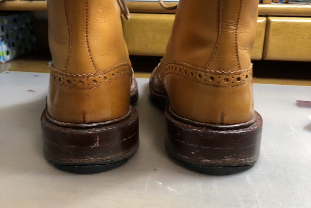 後ろから見ると結構削れているのがわかります。ちなみにこのtricker’sは、ちょうど4ヶ月前くらいにMrミ○ットでかかとを修理してもらったばかりです。